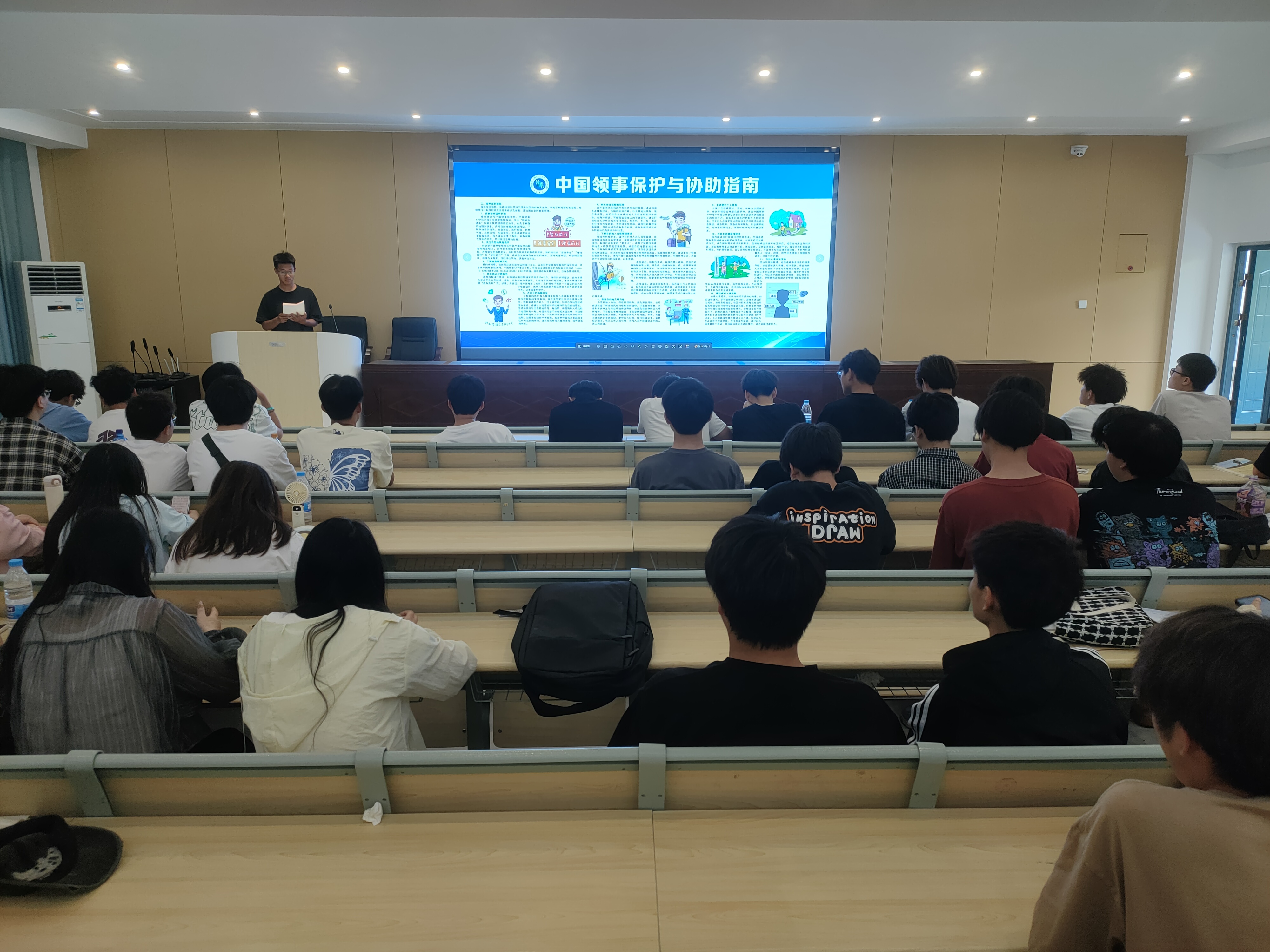 国教院和其他二级学院分别通过制作宣传展板、校园网络平台宣传及召开主题团学会议、班会、绘制黑板报等方式,向师生宣传《中国领事保护与协助指南》,组织学生观看了《中国领事保护与协助指南》系列动画宣传视频,多形式向广大师生科普领事保护与协助、国外旅游安全注意事项、海外出行常见风险种类、海外出行建议、海外安全风险自我防范以及遇到紧急情况如何通过领事保护自救系列知识与方法,引导师生提高风险防范意识和应急处置能力,有效应对海外安全风险。(通讯员:孔学志 审稿:罗超)