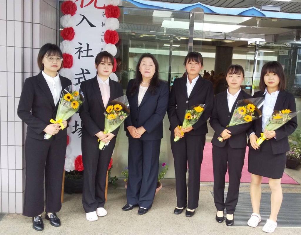 2020年6月,太阳集团8722c护理专业毕业生郭奕鑫、杨隽、王亚茹,朱旭男就职日本海老原集团(海老原医院・养老院),海老原集团的海老原登喜子理事长参加了就职仪式